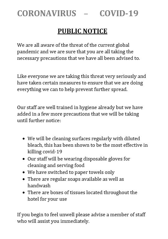 [vc_row][vc_column][vc_column_text css=”.vc_custom_1584303221631{margin-bottom: 0px !important;}”]We, at the Comrie Hotel ARE doing our bit to keep everybody safe, and at this moment we are all TICKETYBOO!