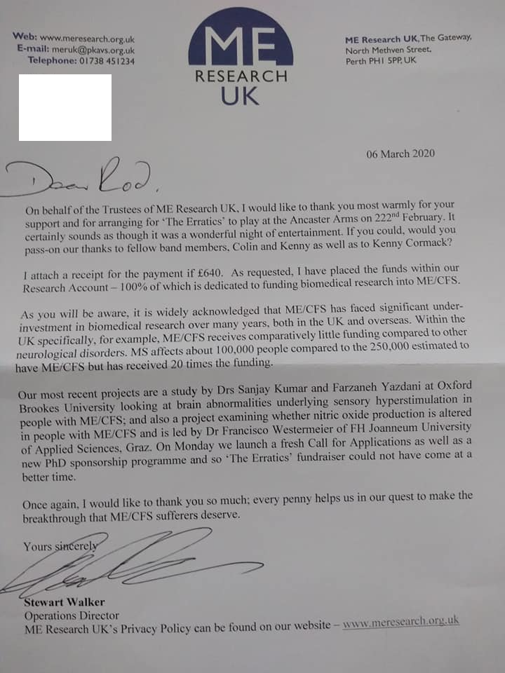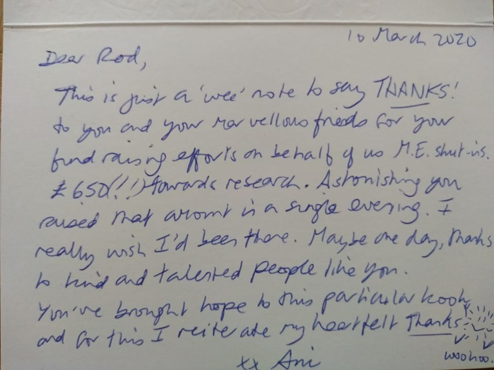 A big thank you from ME Research and a wee thank you from an ME sufferer who is a pal of Lynn’s – and a thank you again from myself and Lynn to all those who supported the fund raiser in the Ancaster Arms last month, to the staff at the Annie. Iain Hansen , Colin Roxburgh and Robin Spearing , Kenny John and Ola , Marc van Grieken etc etc.