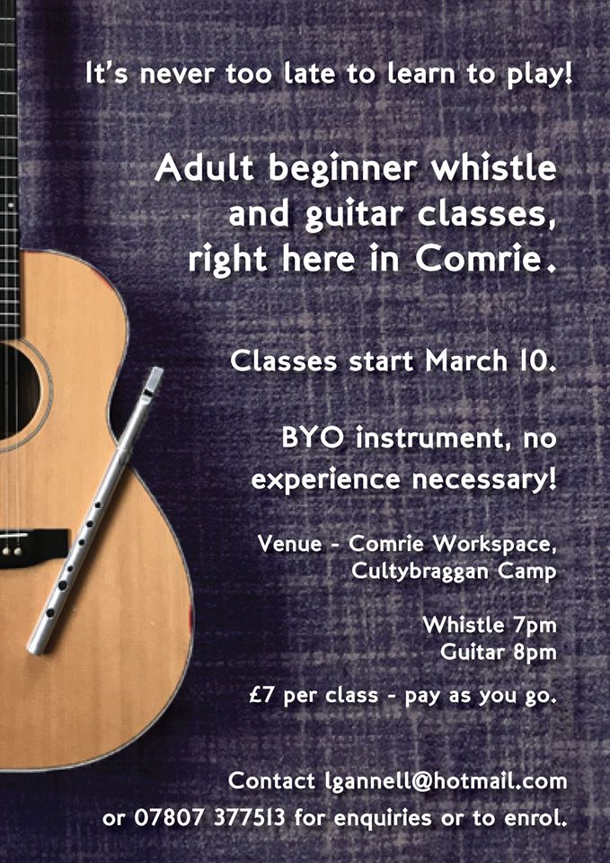[vc_row][vc_column][vc_column_text css=”.vc_custom_1583427626075{margin-bottom: 0px !important;}”]Comrie folk – who’s up for learning an instrument? Kenny and I are looking for takers for whistle and guitar classes here in Comrie, aimed at adult beginners. If you’ve ever thought you’d like to master a tune, now’s the time. You’re never too old! Just get in touch – classes start March 10, Linda
