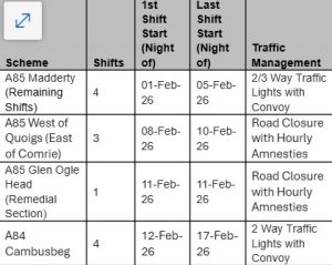 BEAR Scotland have published the following details of upcoming roadworks that will affect Comrie and District this week: